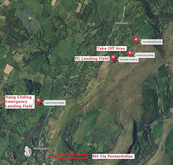 Lots of room to take off - beware turbulence from lower obstructions. Expansive top landing area. Emergency HG bottom landing field in bow of river directly in front (bugs.hypnotist.navigate) - track down over railway but no vehicle access